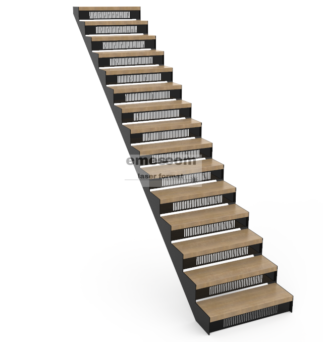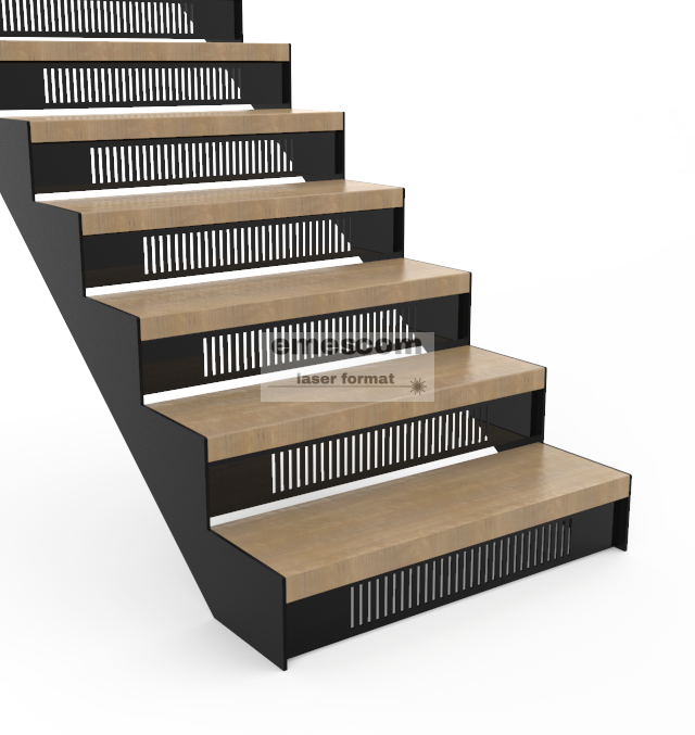 Schody wykonane z blachy stalowej ciętej laserem. Stopnie wykonane z wysokiej jakości drewna dębowego lub bukowego, co gwarantuje elegancki wygląd i naturalną teksturę.